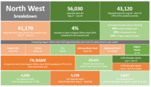 Apprenticeship statistics for 2018/9 are now available. Essential headline data shows that there were 56,030 apprenticeship starts in the North West from August 2018 and August 2019.